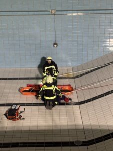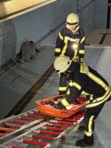 Ein Moment der Unachtsamkeit – und schon kann es passieren: Ein falscher Schritt, der Boden unter den Füßen verschwindet, und plötzlich liegt eine Person schwer verletzt in einem leeren Schwimmbecken. Für Einsatzkräfte bedeutet ein solches Szenario besondere Herausforderungen: große Tiefe, schräge Flächen, eingeschränkte Bewegungsmöglichkeiten und die schwierige Rettung einer verletzten Person.